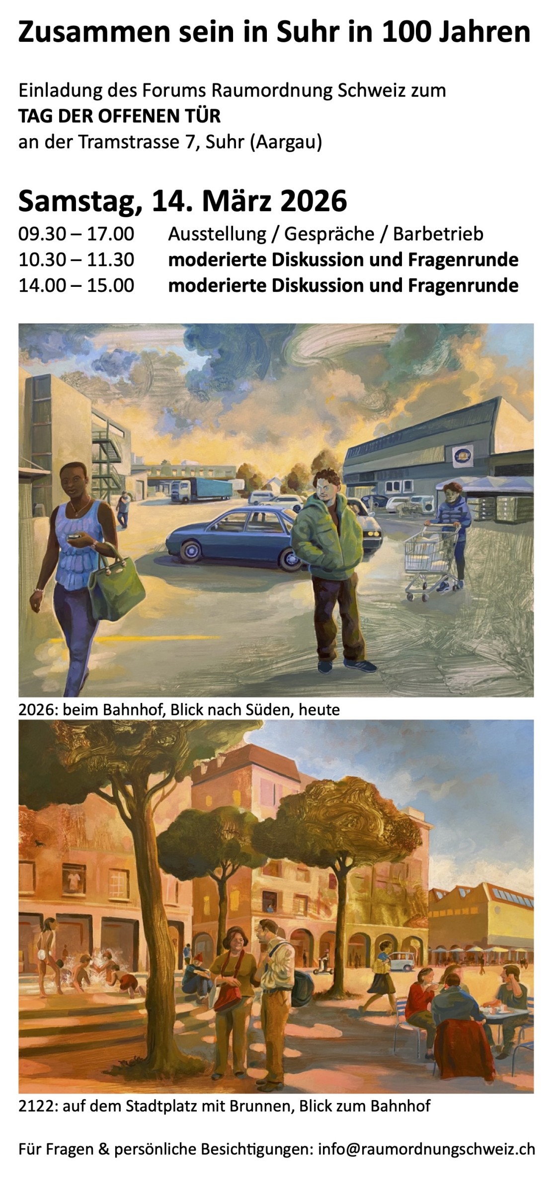 Jetzt öffnet das Forum die Türen für die Bevölkerung. Es zeigt die Pläne, das Ortsmodell, die Zukunftsbilder des Künstlers Andreas Gefe, die Brunnenprojekte des Bildhauers und Künstlers Flurin Bischoff und bietet moderierte Diskussions- und Fragenrunden an: